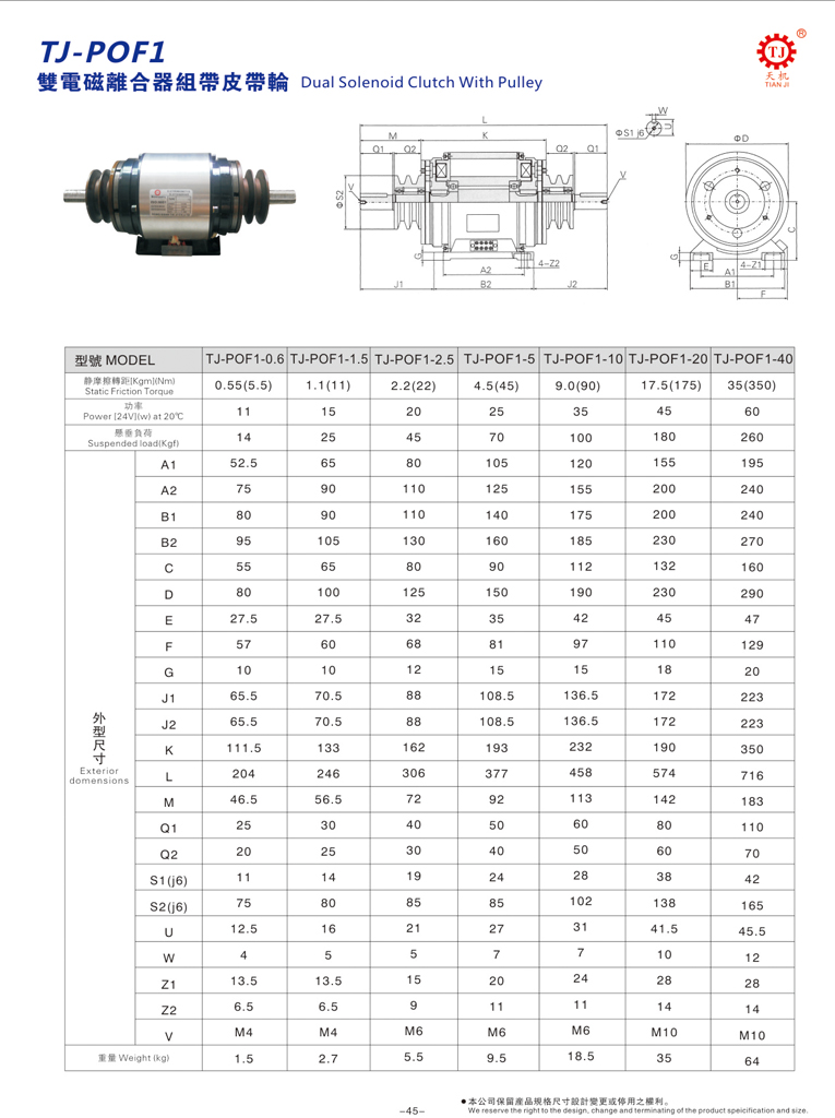 天機(jī)傳動(dòng)雙電磁離合器正反轉(zhuǎn)專用TJ-POF1型附雙皮帶輪,或稱之為雙重電磁離合器組,由兩個(gè)TJ-A型摩擦式電磁離合器組成。獨(dú)特設(shè)計(jì)的組合,摩擦部不易磨耗,動(dòng)作精確、轉(zhuǎn)動(dòng)部分慣性小。其工作原理與TJ-POF2型雙電磁離合組一樣,該型雙電磁離合器組合適,常規(guī)扭矩 6Nm~400Nm。
