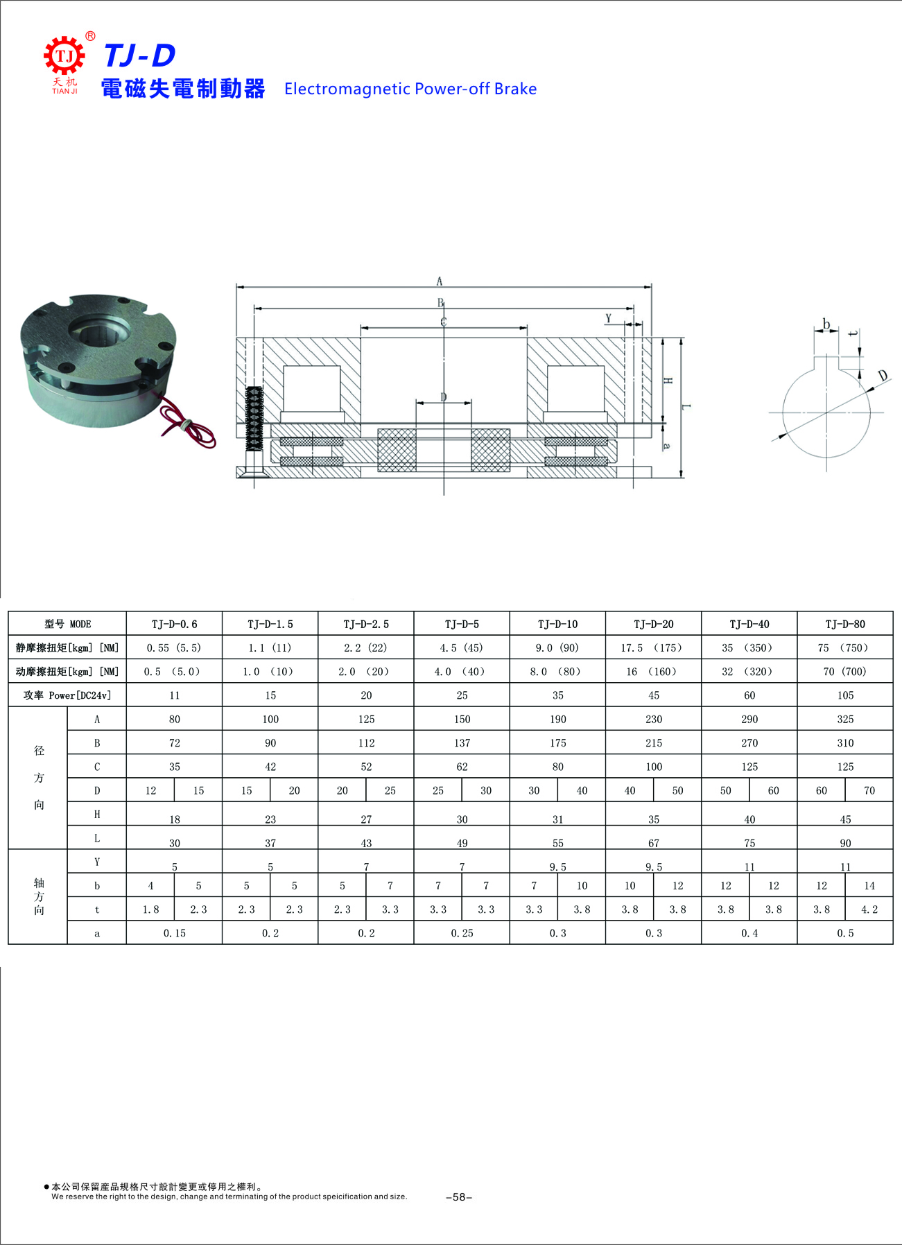 天機(jī)傳動(dòng)電磁失電制動(dòng)器(TJ-D)的安裝尺寸及規(guī)格參數(shù)如下: